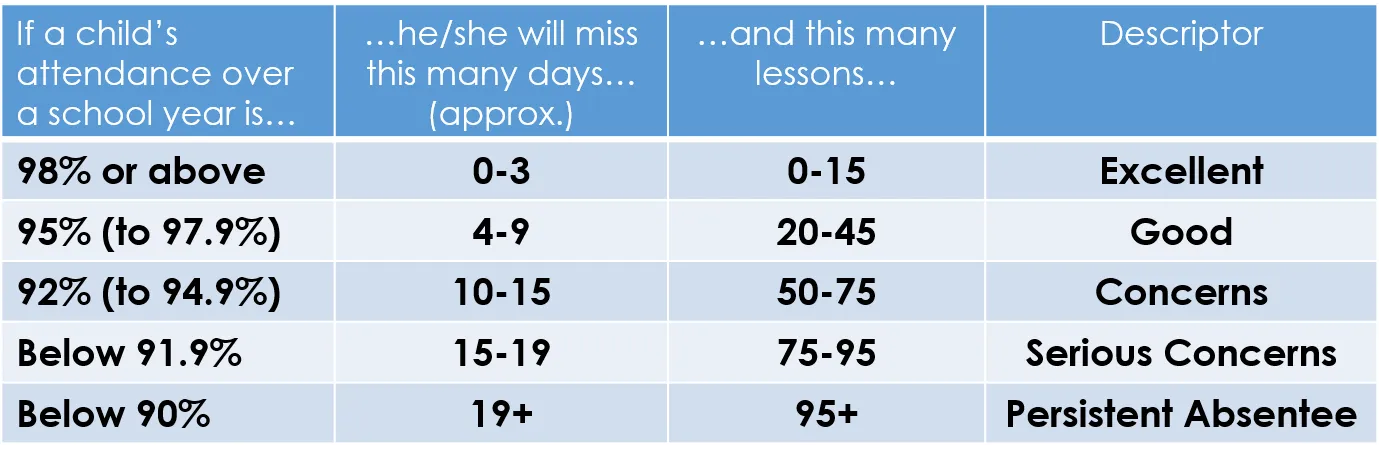 Please see table below which explains the ratio between number of lessons missed and your child's attendance percentage: